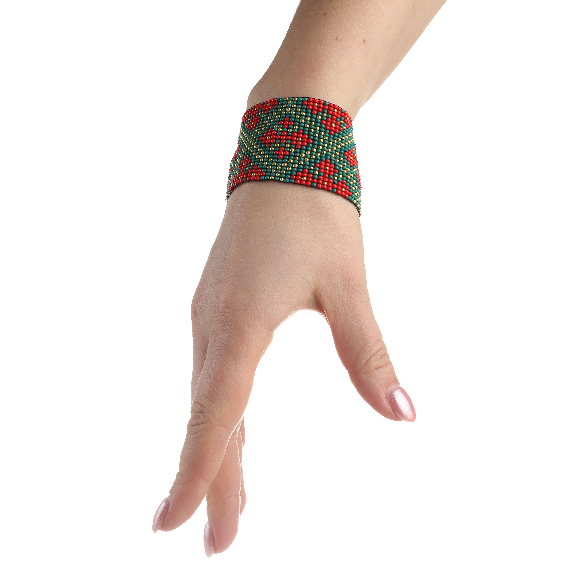 Браслет з бісеру, зелено-червоний орнамент