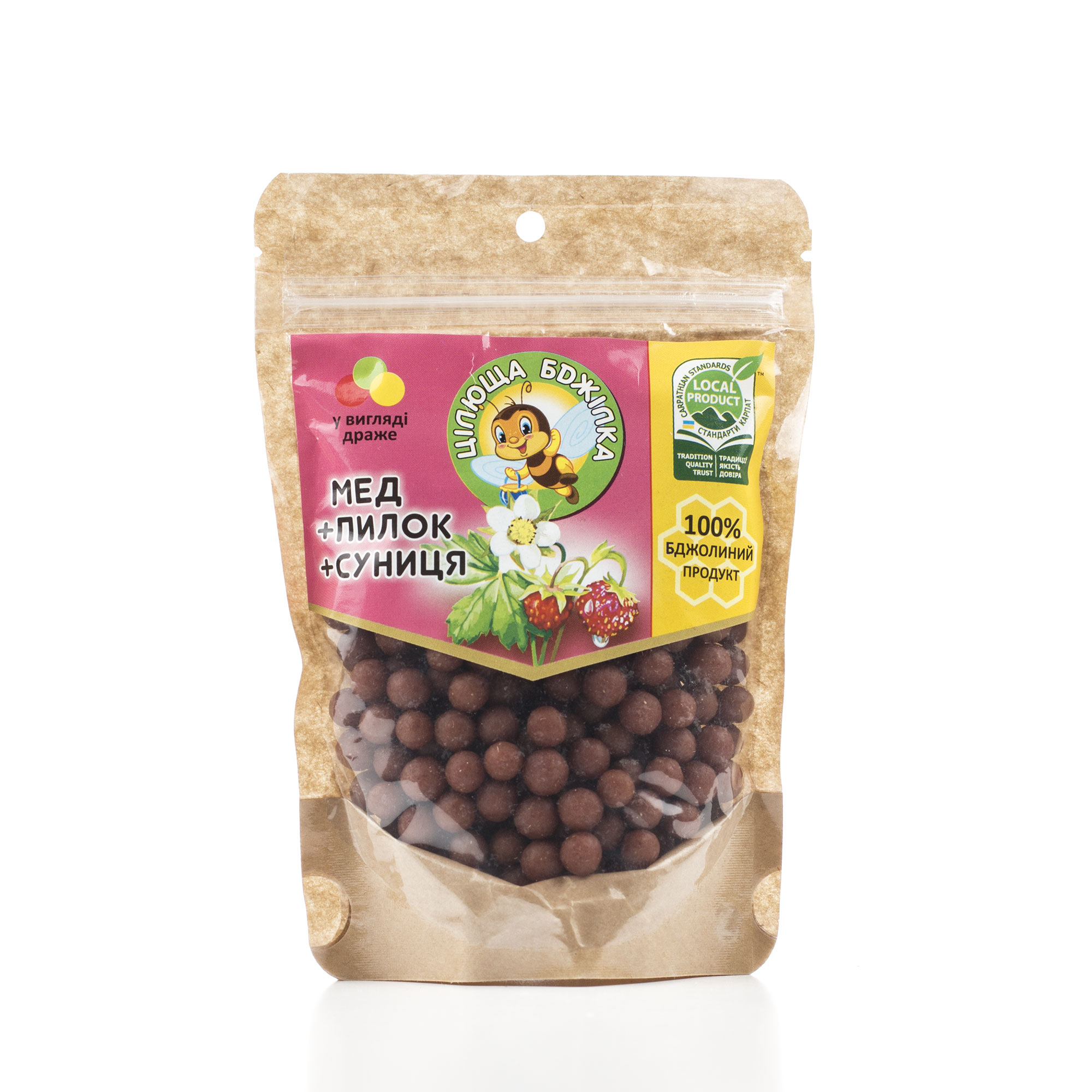 Склад : мед карпатський, пилок бджолиний з цукровою пудрою, віск бджолиний, суниця сублімована, солод розчинний, патока.