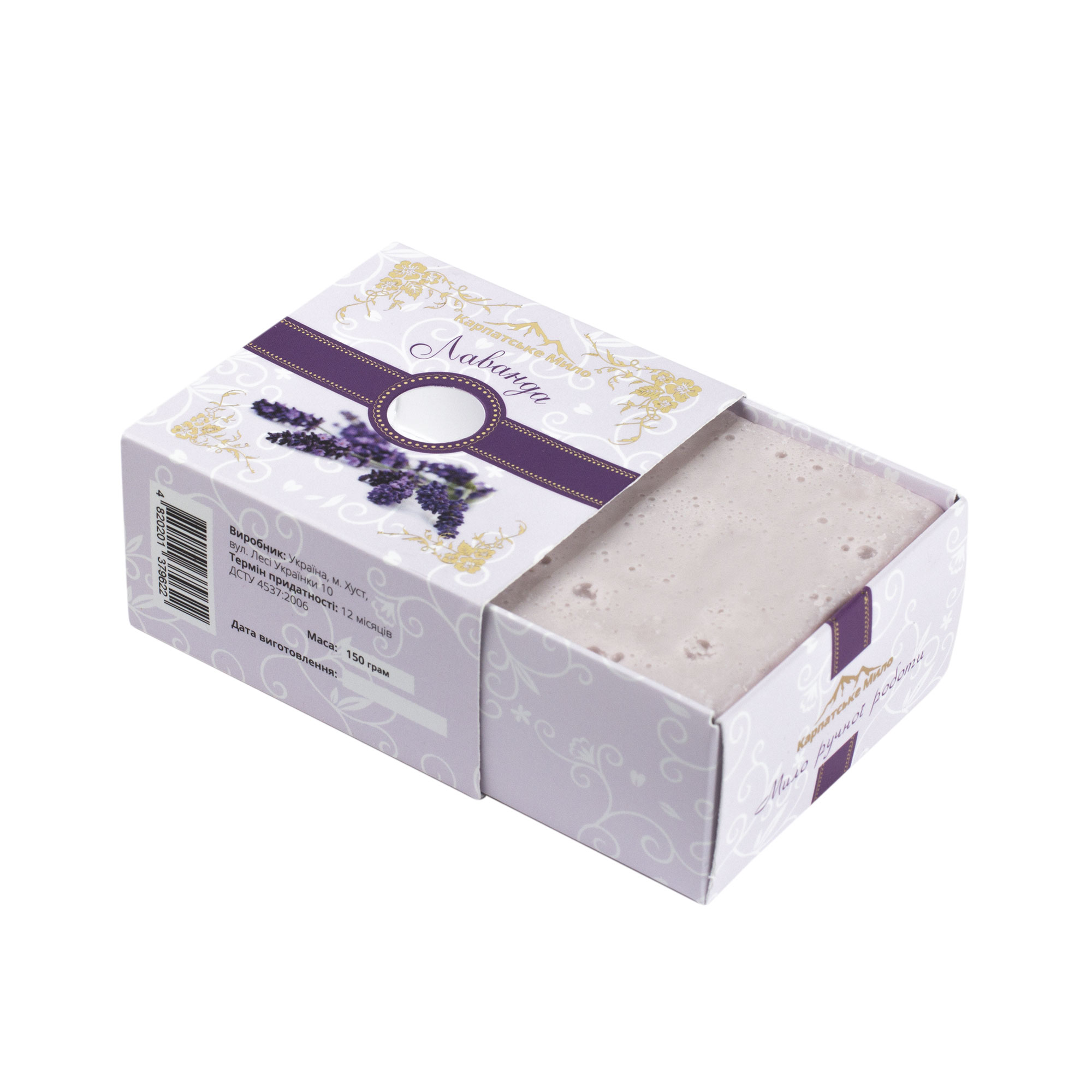 Склад: органічна мильна основа, екстракт лаванди, олія виноградних кісточок, аромат лаванди.