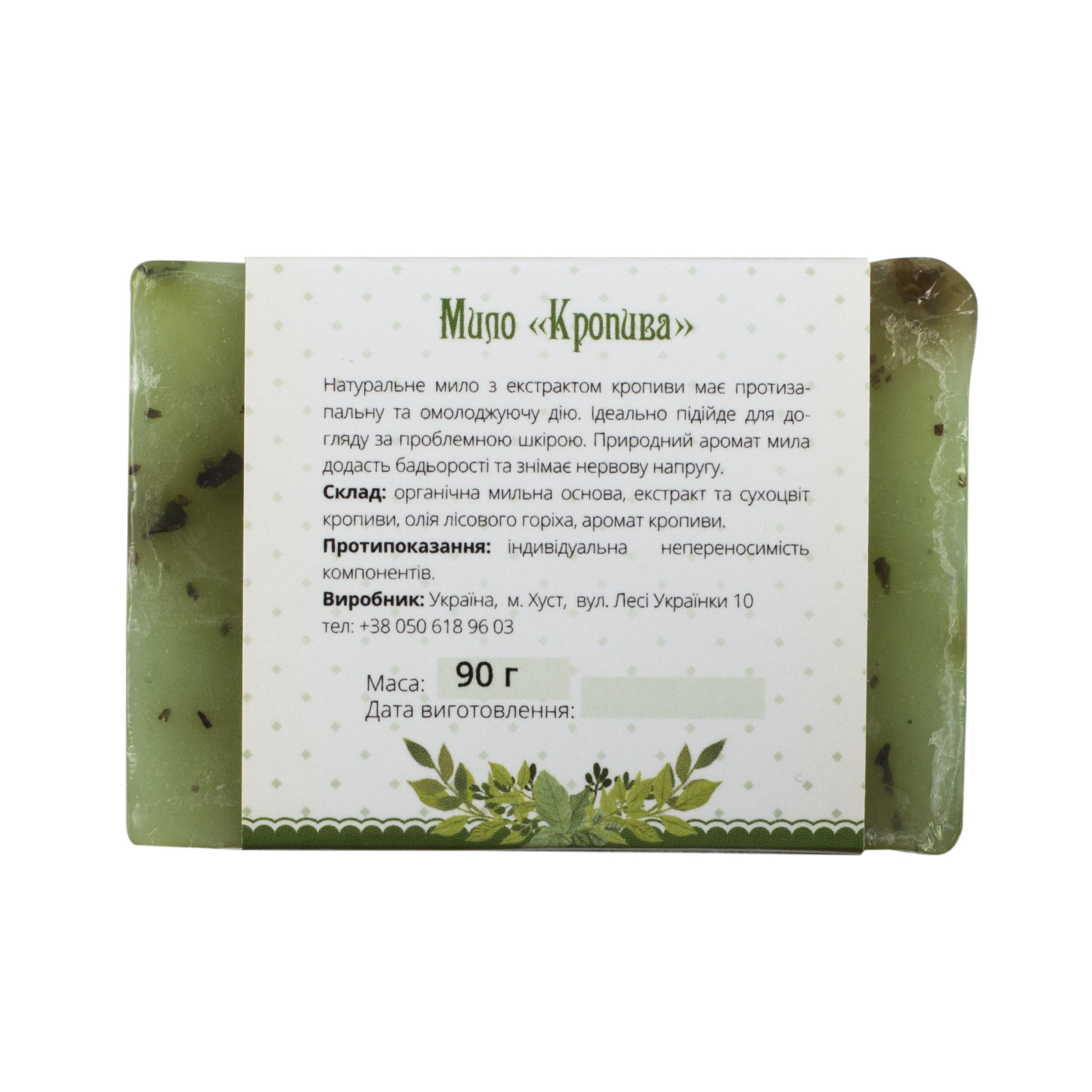 Склад: органічна мильна основа, екстракт та сухоцвіт кропиви, олія лісового горіха, аромат кропиви.