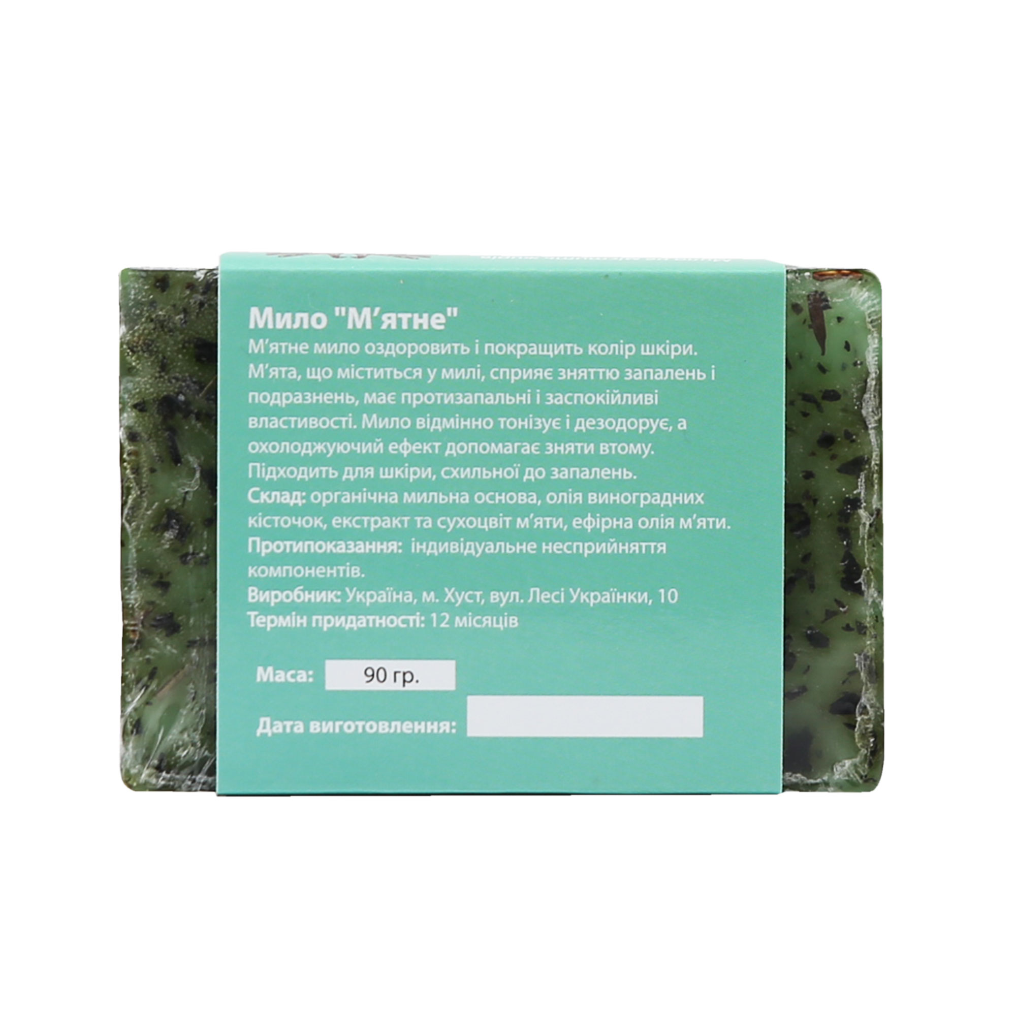 Склад: органічна мильна основа, олія виноградних кісточок, екстракт та сухоцвіт м’яти, ефірна олія м’яти.
