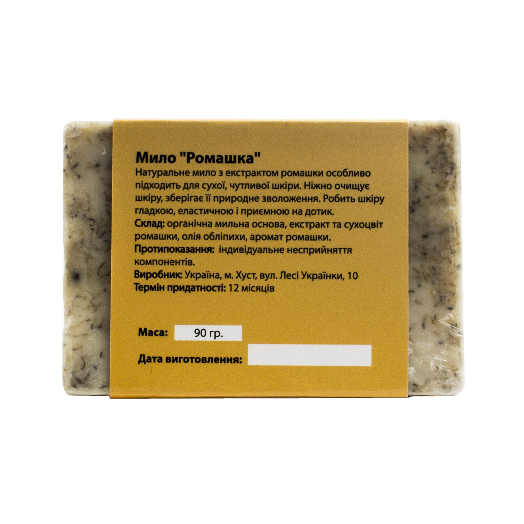 Склад: органічна мильна основа, екстракт та сухоцвіт ромашки, олія обліпихи, аромат ромашки.