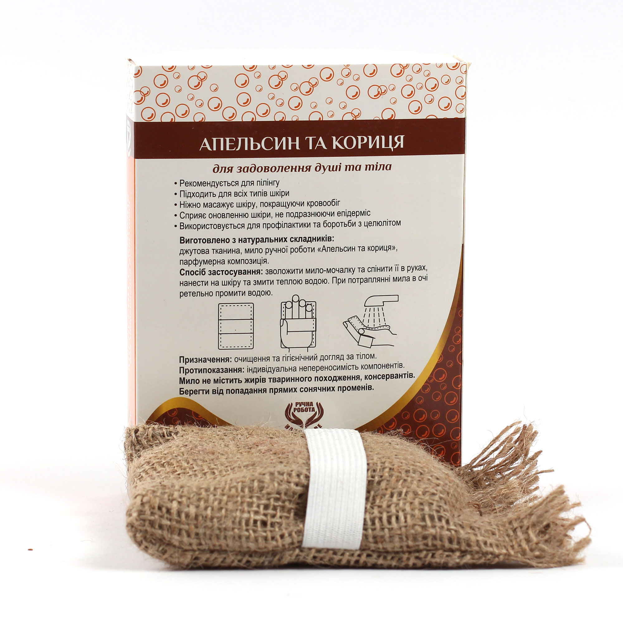 Склад: джутова тканина, мило ручної роботи “Апельсин та кориця”, парфумерна композиція.