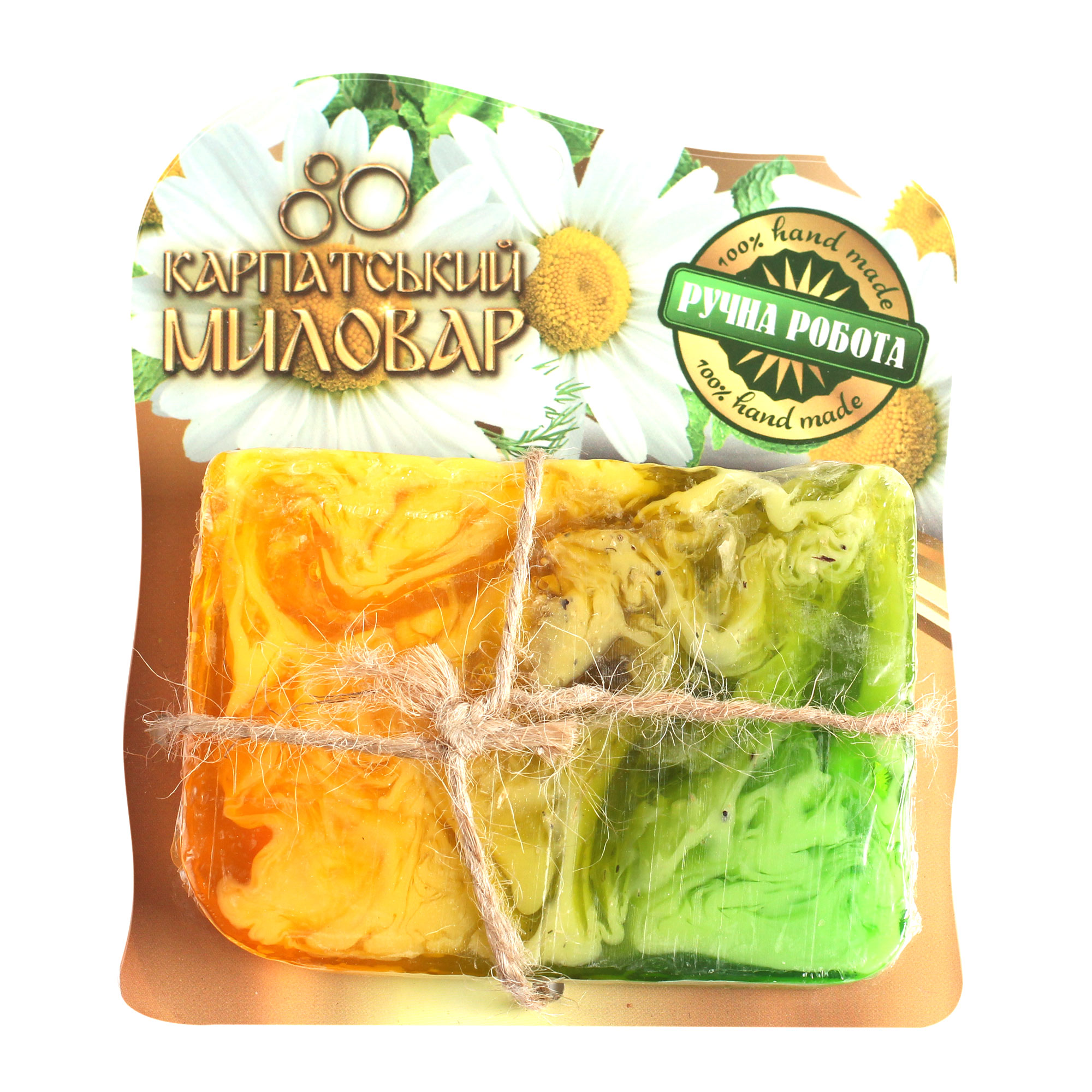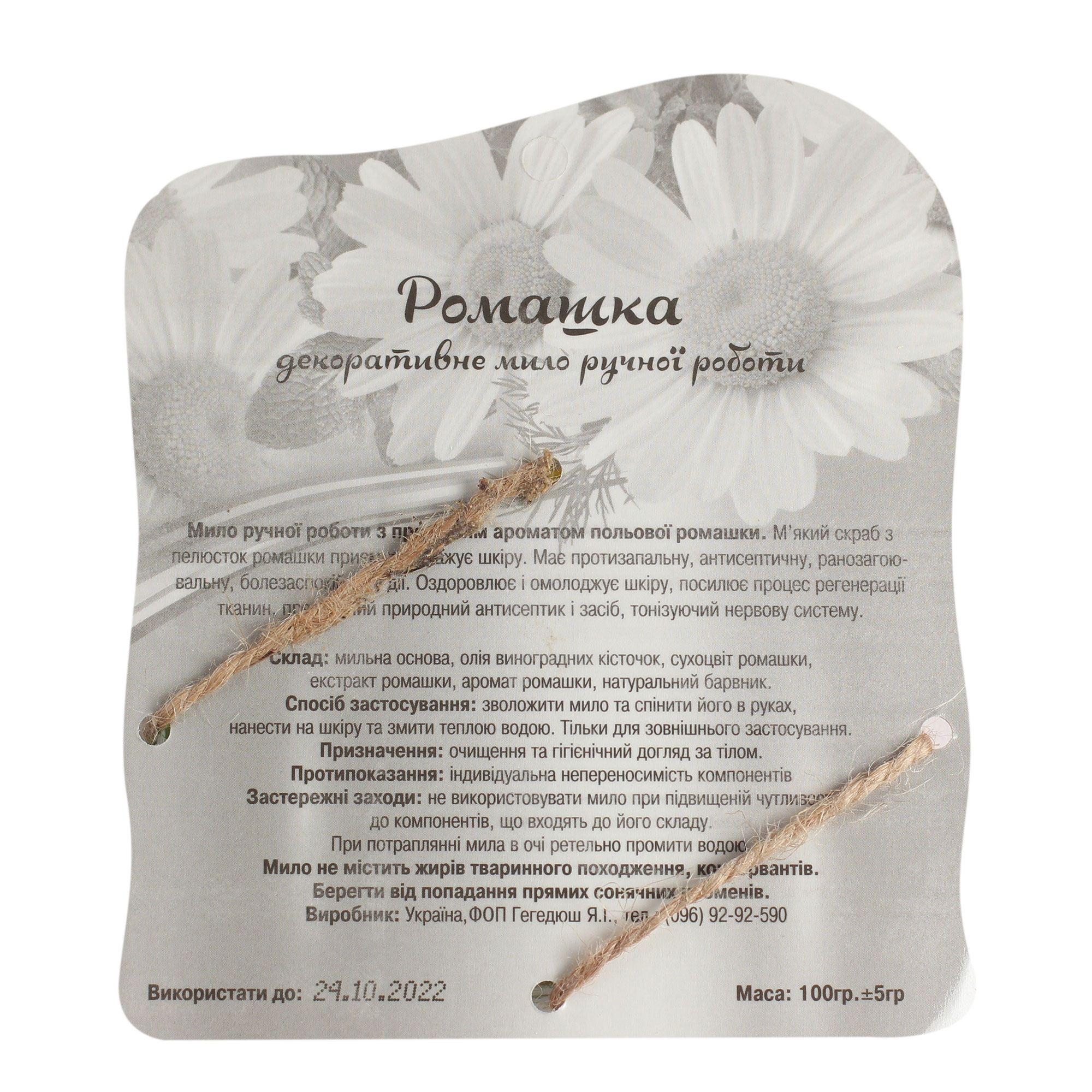 “Ромашка” Мило ручної роботи з приємним ароматом польової ромашки. М,який скраб з пелюсток ромашки приємно масажує шкiру. Має протизапальну, антисептичну, ранозагоювальну, болезаспокiйлеву дiї. Оздоровлює i омоложує шкiру, посилює процес регенерацiї тканин, прекрасний природний антисептик i засiб, тонiзуючий нервову систему.