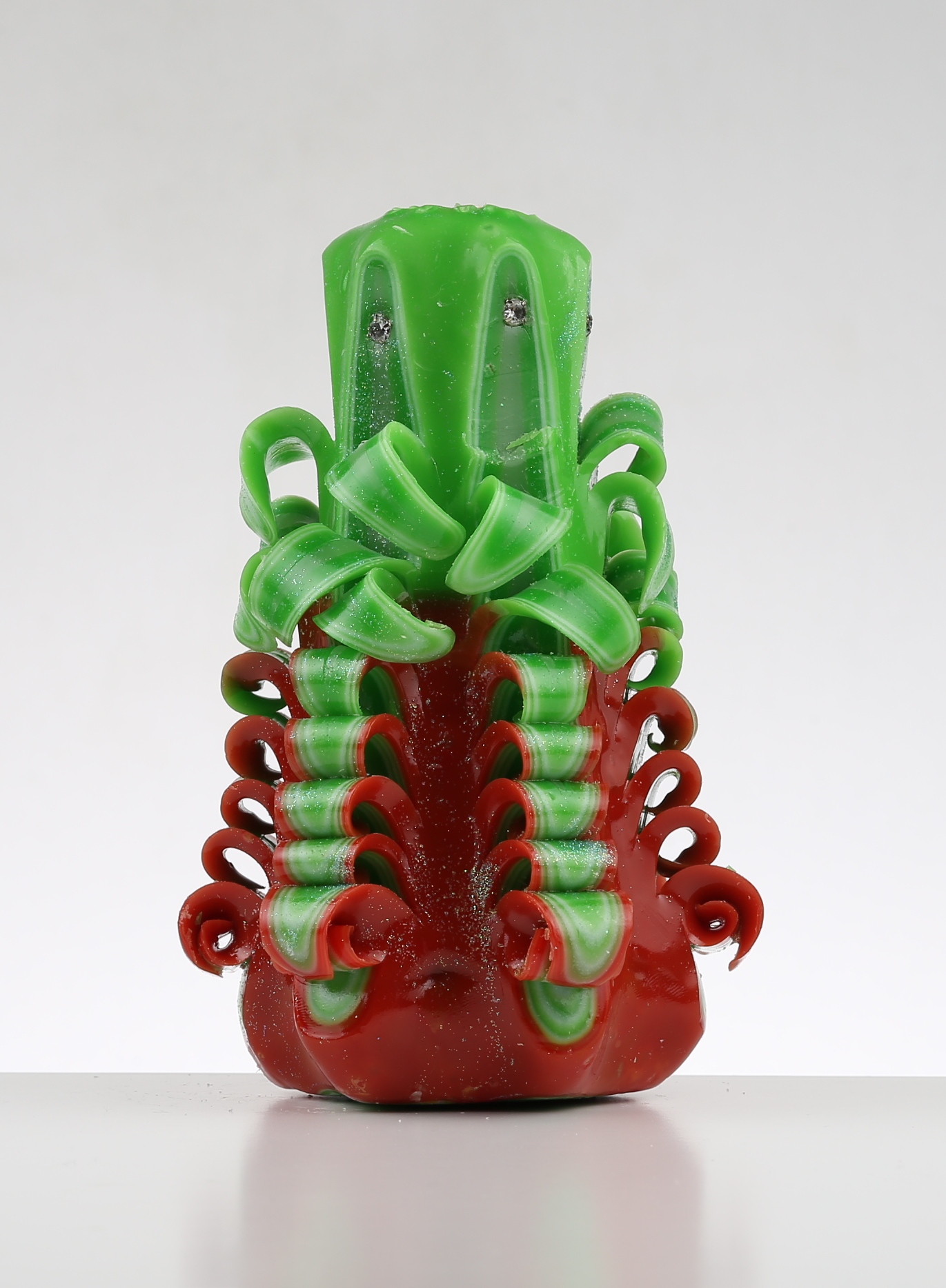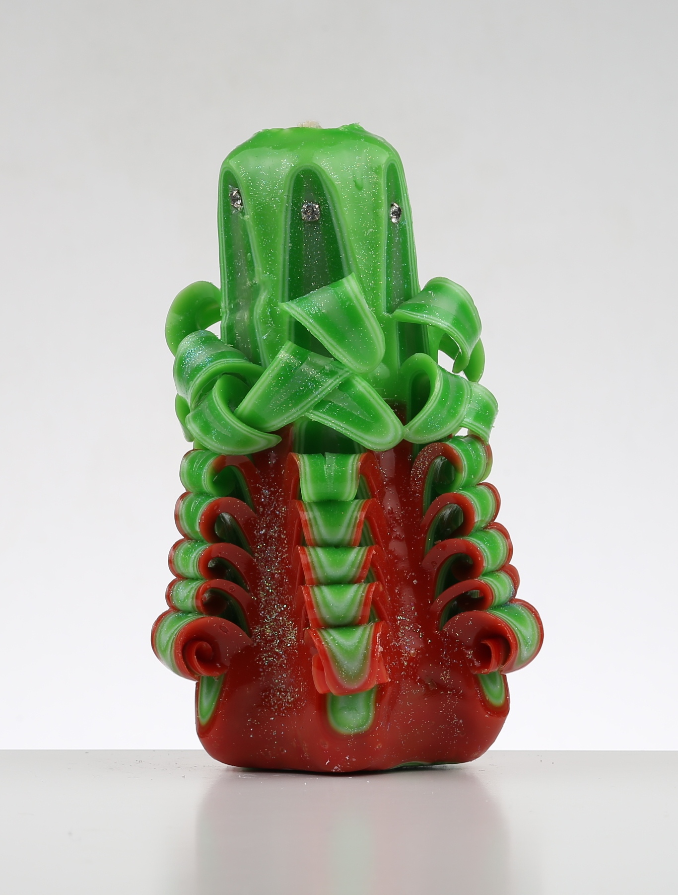 Свічка темно червоно-зелена ручної роботи , різьблена .