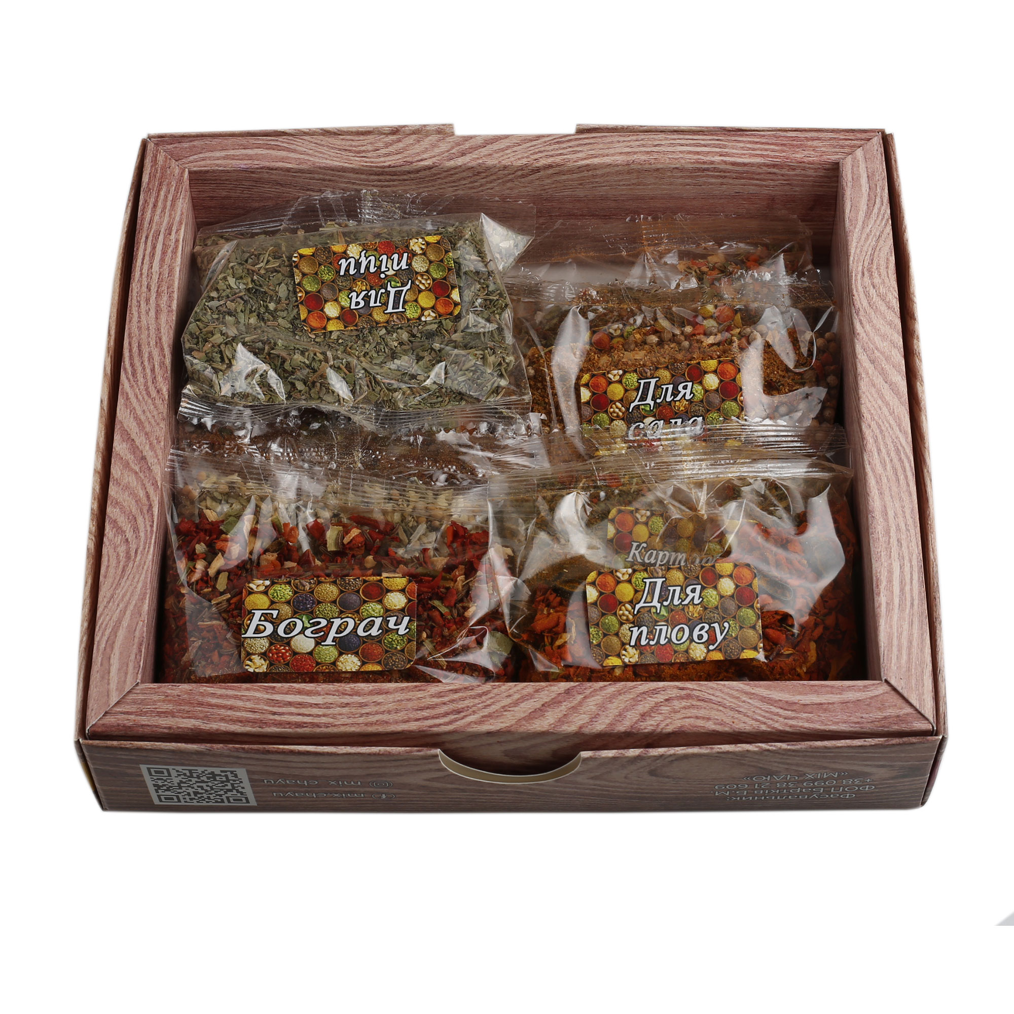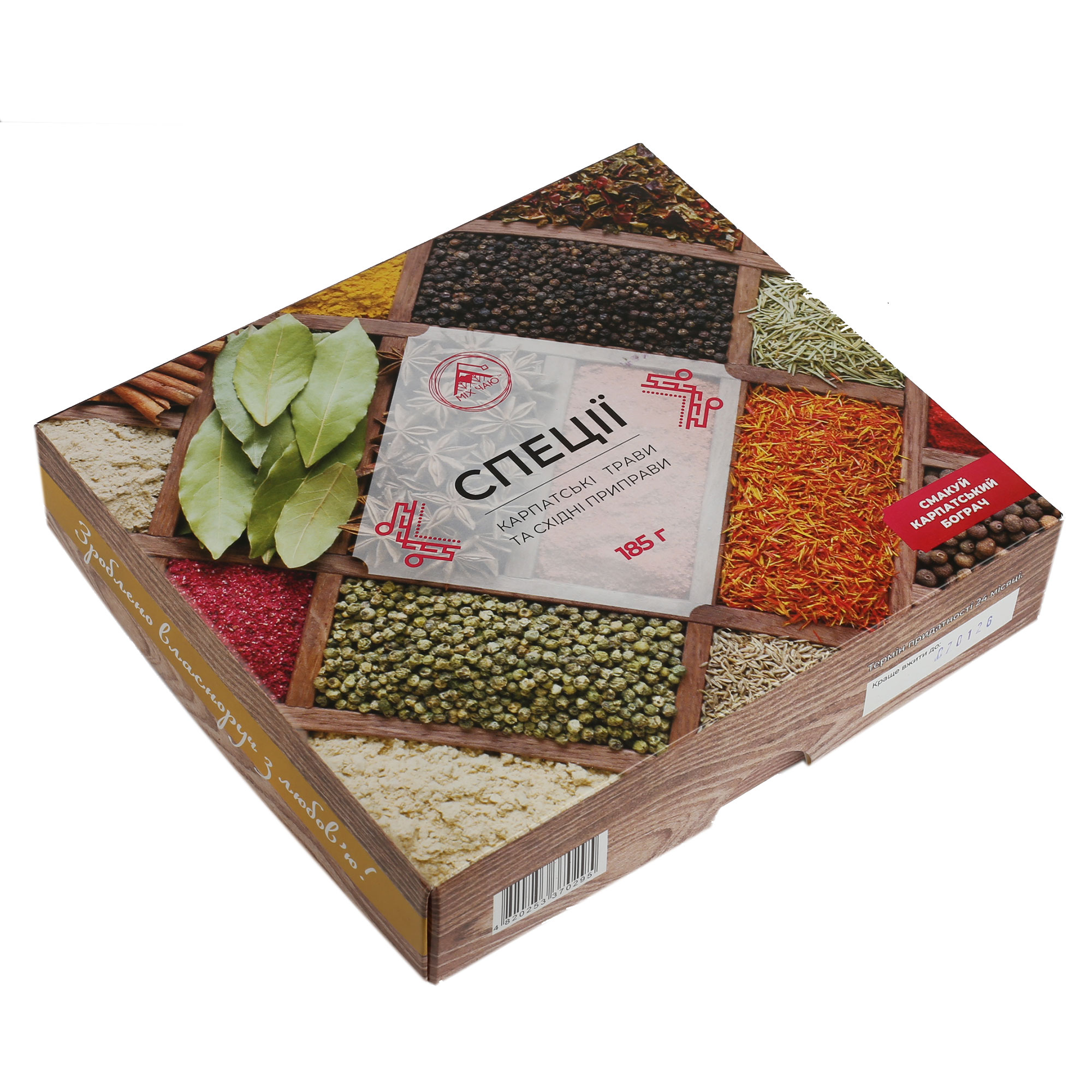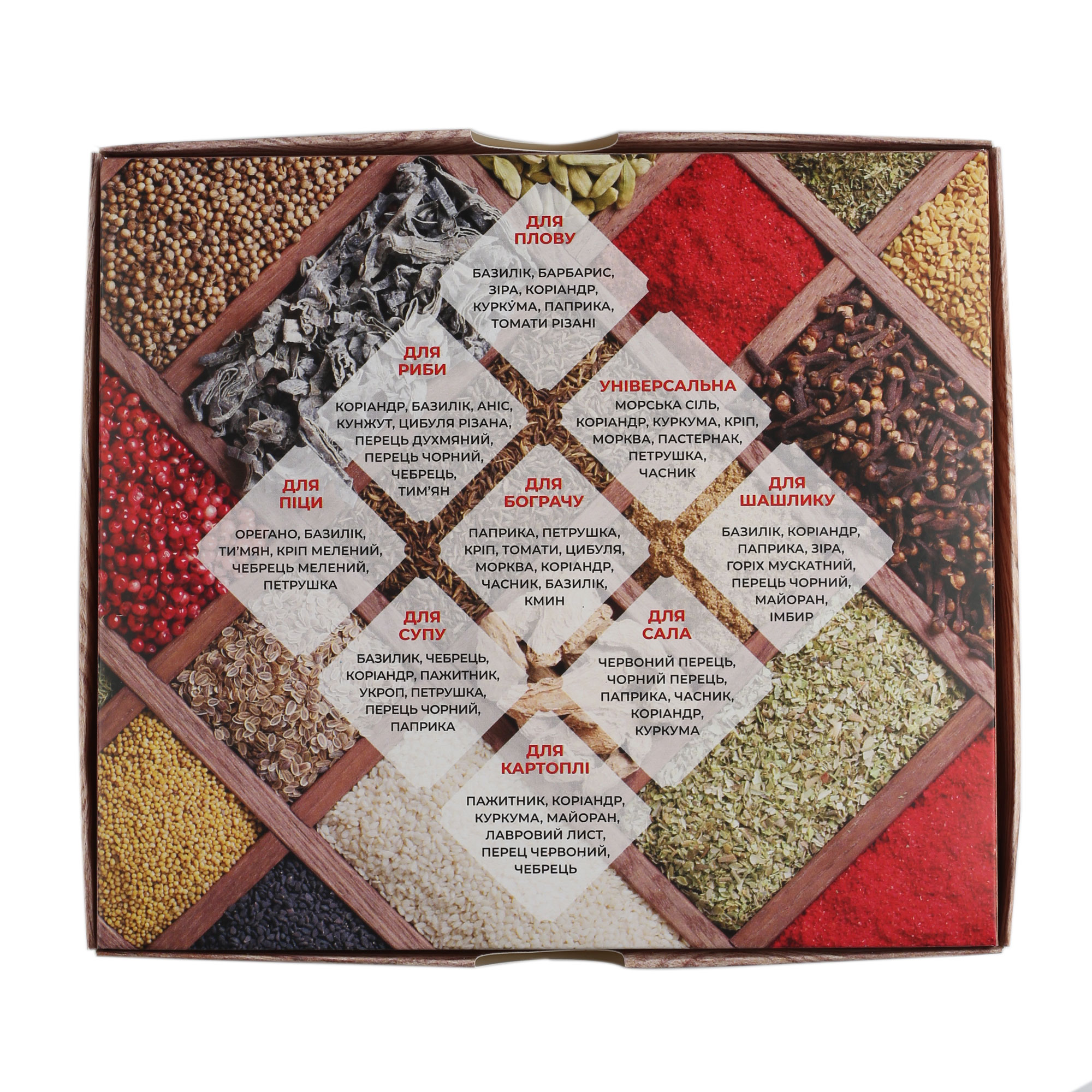 Склад: коріандр, базилік, аніс, кунжут, цибуля різана, перець духмяний, перець чорний, чебрець,тим’ян.