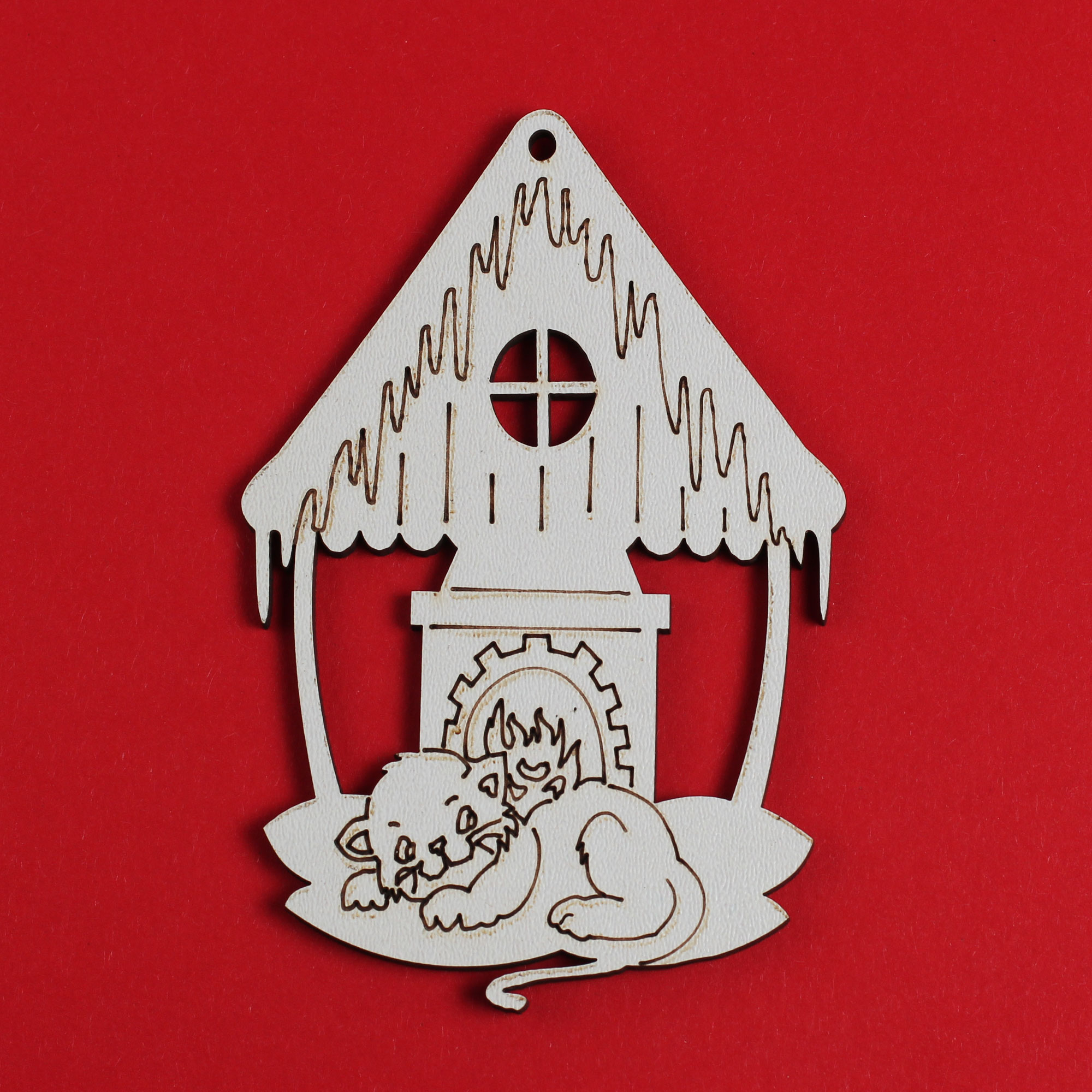 Новорічна, одностороння, дерев’яна іграшка “Кіт під хатою” .