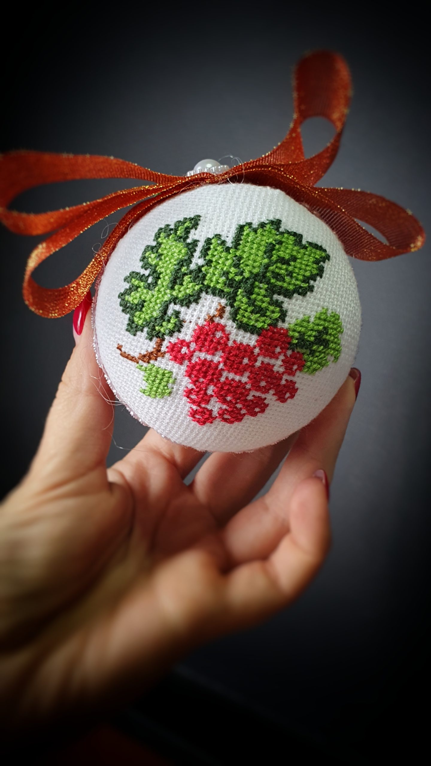 Новорічна вишита іграшки – кулька, м’ягка та приємна на дотик